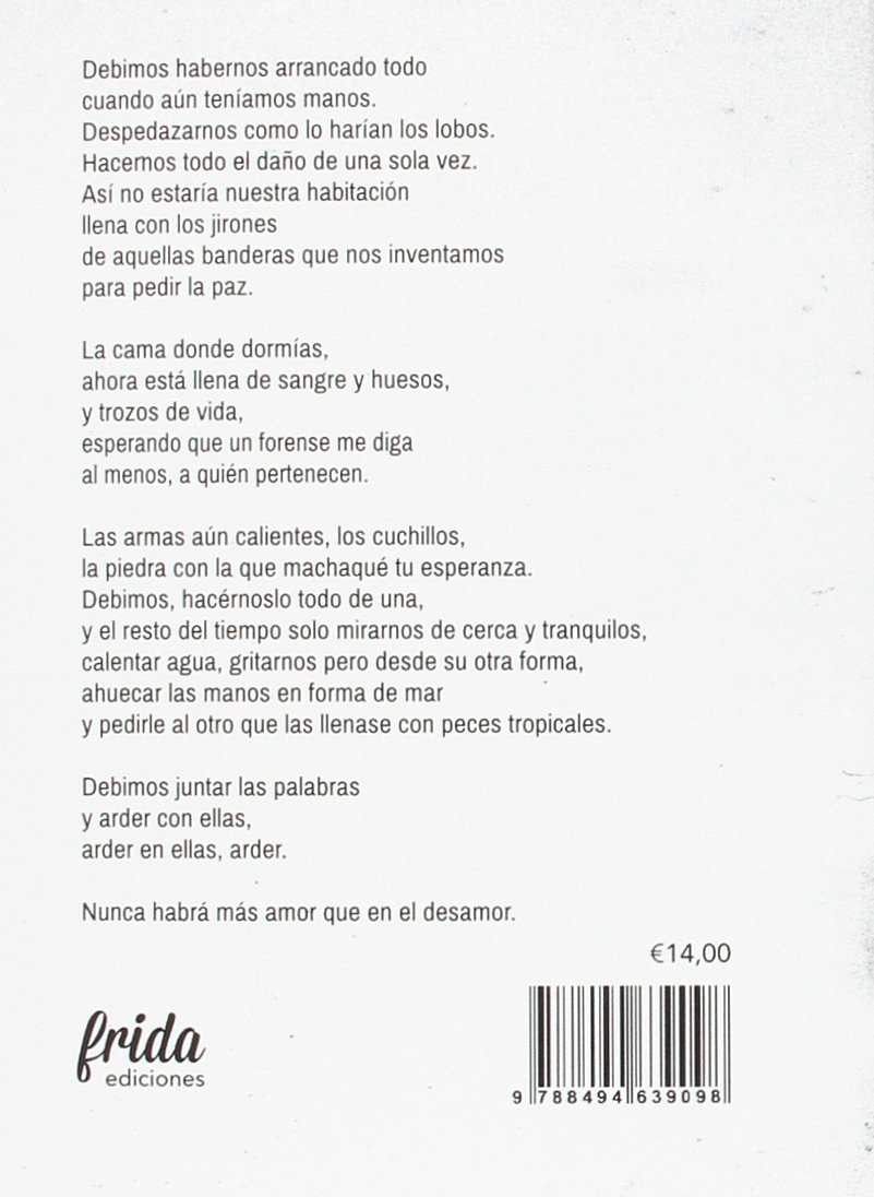 La lectura de Ama o arde es interesante por su poesía intensa y visceral sobre amor y desamor, que explora los extremos emocionales con crudeza y sin filtros sentimentales. Disecciona el ciclo completo del amor —del ardor inicial a la ceniza del desamor— con imágenes impactantes como despedazarse "como lobos" o "arder en las palabras", reflejando la tesis de que "nunca habrá más amor que en el desamor". Poesía directa que conecta con lectores por su honestidad emocional, ideal para quienes buscan catarsis en el verso contemporáneo. Además, la forma en que el autor juega con el lenguaje evoca un sentido de inmediatez y urgencia que atrapa al lector, creando una experiencia inmersiva. Palabras que fluyen como un río de emociones, cada verso se siente como un latido del corazón, permitiendo a los lectores no solo reflexionar sobre sus propias experiencias amorosas, sino también sentirlas en un nivel profundo y visceral. Esta habilidad del autor para comunicar lo inefable del amor y la pérdida hace de Ama o arde una lectura esencial para quienes buscan entender las complejidades del amor moderno.